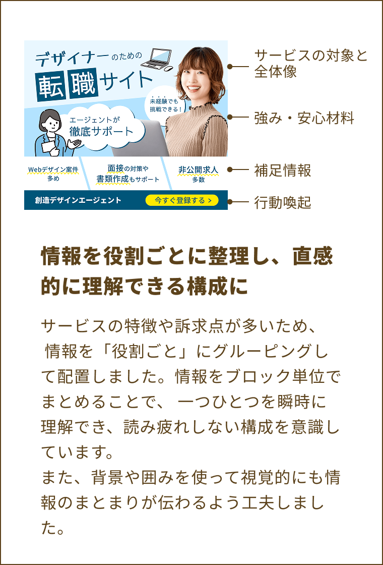 転職を検討中のWebデザイナーに向けて、手厚いサポート体制と安心感を訴求し、会員登録を促す。
