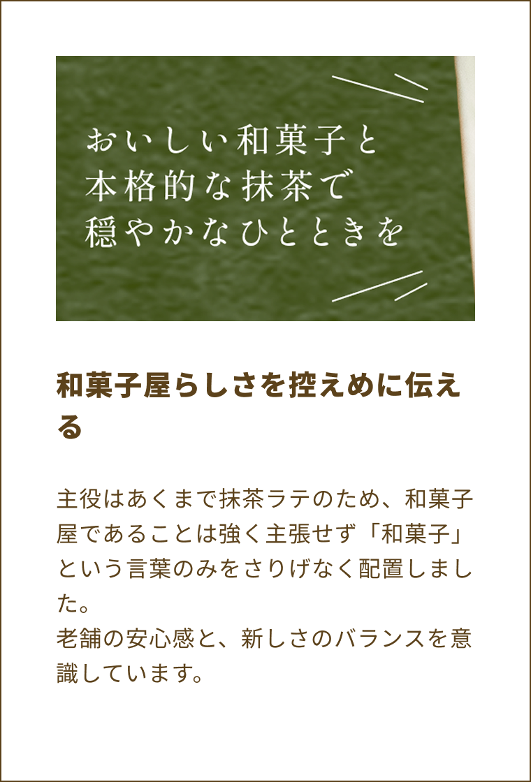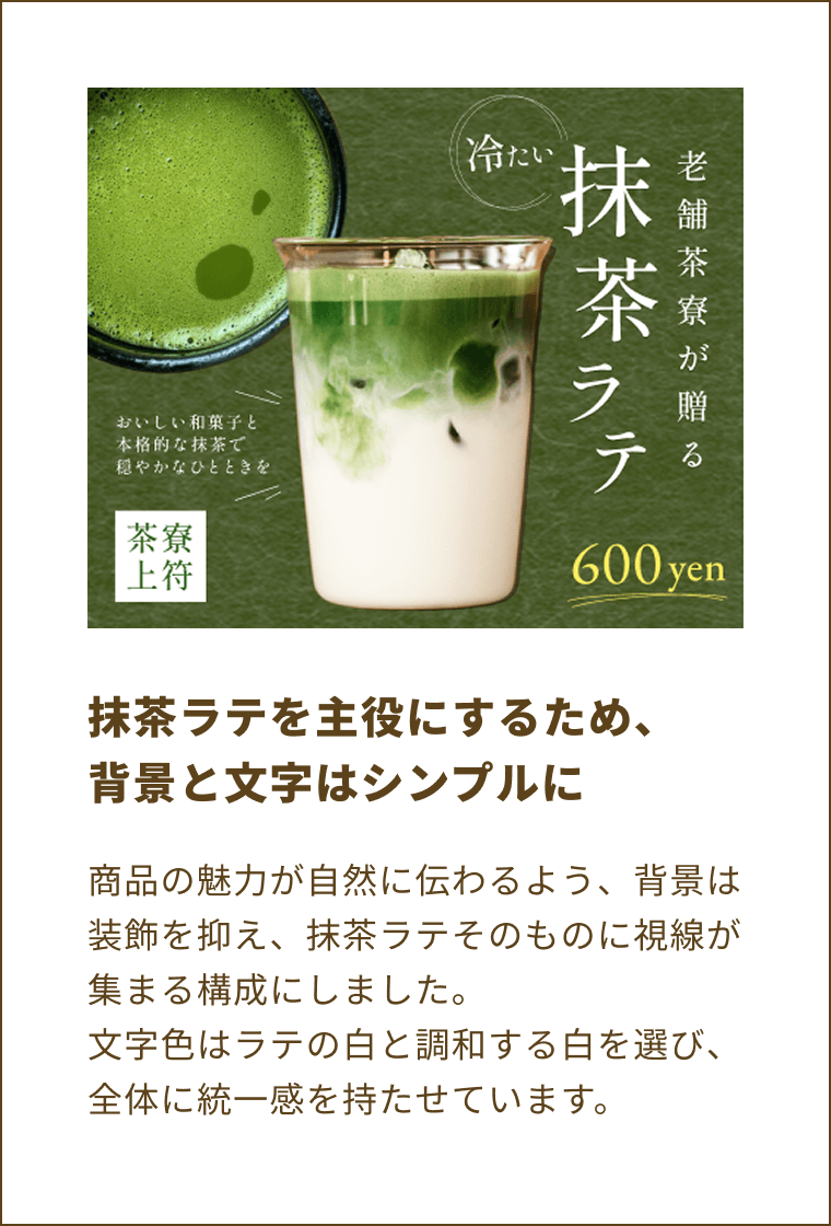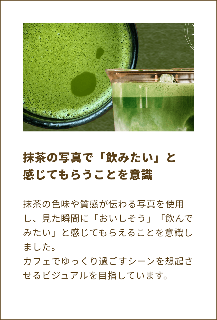若者層の新規来店を促進し、本格的な抹茶の味わいを気軽に楽しめる商品であることを伝える。